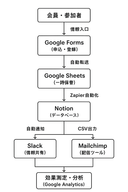 具体的には、Google Forms、Google Sheets、Zapier、Notion、Slack、Google Analyticsという6つのツールを体系的に連携させることで、会員管理からニュースレター配信、さらには効果測定に至るまでの一連のプロセスを、自動化・統合されたシステムとして機能させることが可能となります。